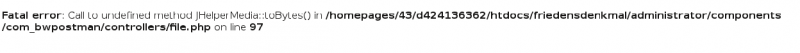 Die Fehlermeldung sagt eigentlich, dass in der Datei "<joomla root>/libraries/cms/helper/media.php" die Funktion "toBytes" fehlt.