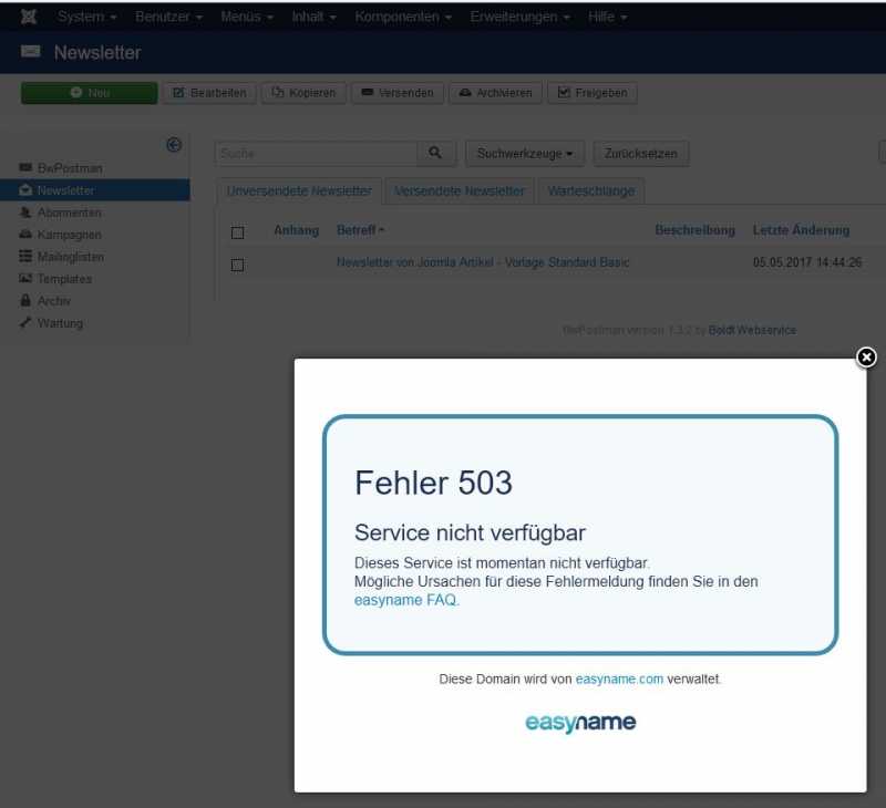 Fehler 503 ist ganz sicher keine Meldung von BwPostman. Das ist eine Meldung von deinem Webserver, dass er vorübergehend Migräne hat oder so was. Ob die 503 auch kommt, wenn der Mailserver nicht erreichbar ist oder Dir eine Zwangspause verpasst, kann ich so nicht sagen. Ich könnte mir aber auch vorstellen, dass so was auftritt, wenn Du keine stabile Internetverbindung hast.