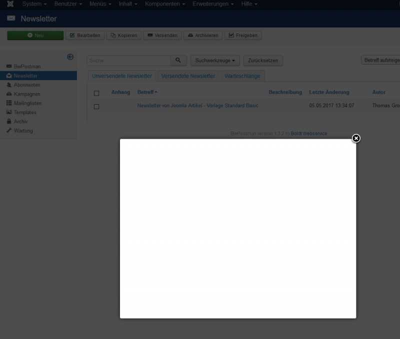 die Fenster-Anzeige bleibt bei mir leer, sowohl beim Test- als auch Versand des NLs. Klick auf des Schließen-Kreuz des Fensters ohne Erfolg.