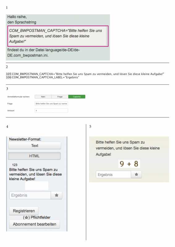 In BwPostman Konfiguration habe ich in CAPTCHA eingegeben: Bitte helfen Sie uns Spam zu vermeiden, und lösen Sie diese kleine Aufgabe!