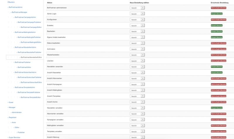 Wie Du in den Benutzergruppen von Joomla sehen kannst, sind alle Untergruppen von BwPostman vom BwPostmanAdmin abgeleitet. Bei BwPostmanAdmin sind die Rechte gesetzt, alle Untergruppen dürfen nur Teile davon, denen werden also, wie Du richtig festgestellt hast, die Rechte von der Eltern-Gruppe erst mal vererbt und dann gegebenenfalls entzogen.