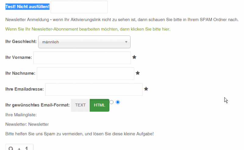 Habe soweit alles nach Anleitung gemacht, aber wenn ein User sich zum Newsletter eintragen will, dann kommt an erster Stelle immer ein Feld mit der Bezeichnung : Test! Nicht ausfüllen!