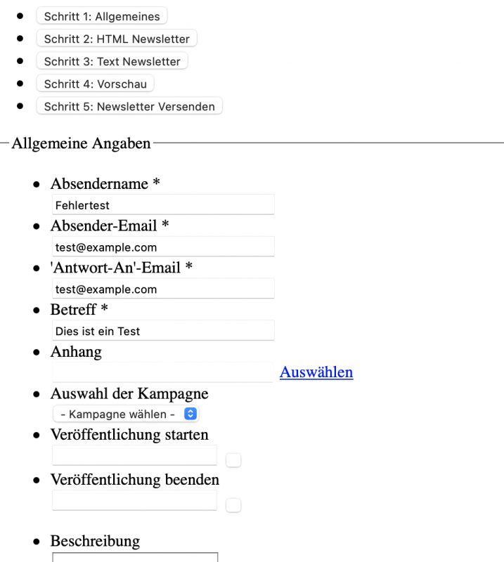In dem Moment, in dem ich das ganze über den Knopf "Speichern" speiechere, sehe ich aber nur noch eine weiße Seite. Über Browser Back und klick auf den soeben angelegten Newsletter komme ich zwar wieder rein, ab jetzt ist die Darstellung des ersten Reiters allerdings zerschossen (siehe Anhang) und bei allen weiteren Reitern bekomme ich nur noch die Meldung 500 Layout „default“ nicht gefunden!.