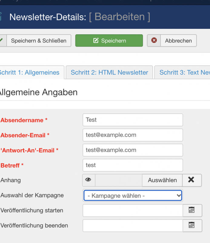 seit kurzem habe ich folgendes Problem: Ich kann im bwPostman einen Newsletter über den Knopf "Neu" wunderbar anlegen, wähle meine Empfängergruppe aus und einen entsprechenden Artikel, der im Newsletter angeteasert werden soll. Auch die Vorschau der HTML-Version und der Text-Version funktioniert.