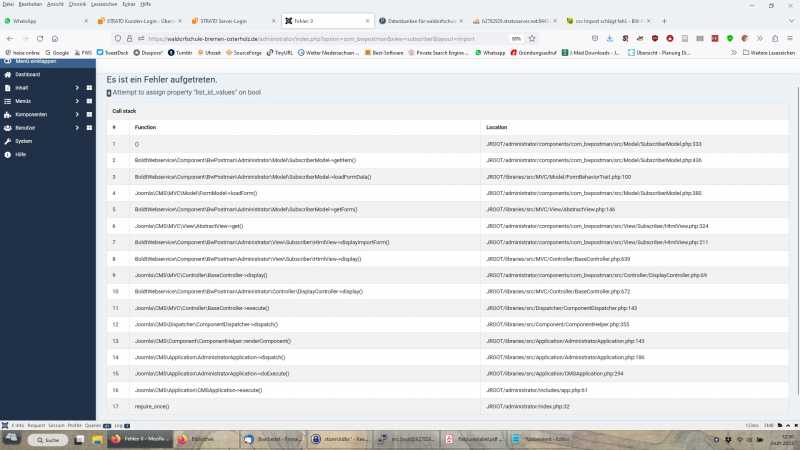 Nur der Vollständigkeit halber: Die von Dir erwähnte Meldung mit strftime() hat nicht direkt etwas mit BwPostman zu tun. BwPostman verwendet ein Kalenderfeld, das von Joomla! bereit gestellt wird und da ist diese veraltete Funktion noch drin. Ich habe solche Meldungen in BwPostman selbst mit dem letzten Release hoffentlich abgestellt.