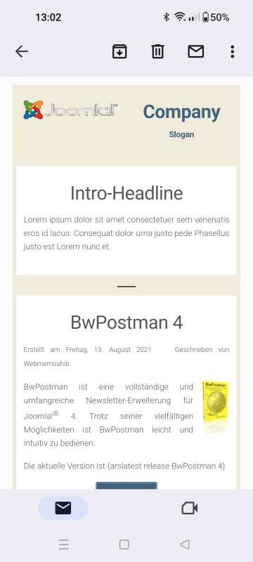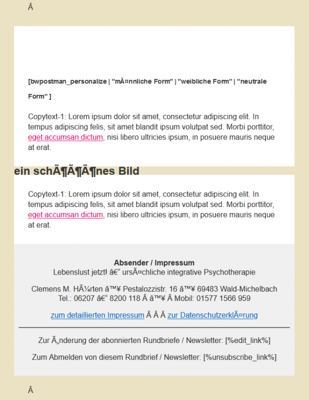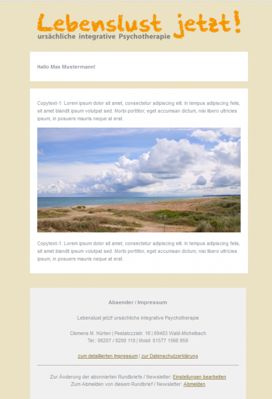Romana hat mir gestern Abend noch einen Testnewsletter mit dem Template „Standard Creme“ auf Handy geschickt.