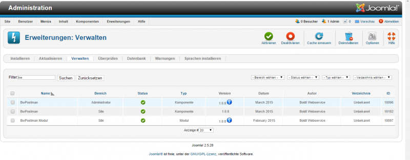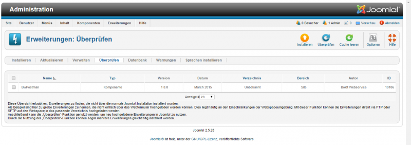 Noch das BwModule installieren mod_bwpostman.1.0.8.zip