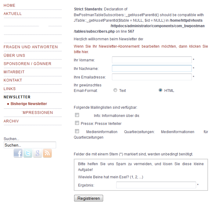 Aber nun zu dem Fehler, der gar keiner ist, denn er ist eine Warnung, die nur auftritt, wenn E_STRICT bzw. E_ALL eingeschaltet ist. Damit wird strengste Regelkonformität bei php-Anweisungen quasi erzwungen. Aber es gibt Dinge zwischen Joomla 2.5 und Joomla 3, die lassen sich auch mit einer Weiche nicht umgehen. Hier ist es konkret so, dass die Definition einer Joomla-eigenen Funktion zu Tabellen unter Joomla 2.5 anders war als sie nun in Joomla 3 ist, die mich vor die Wahl gestellt hat, entweder diese Warnung zu akzeptieren oder Joomla-Funktionen für BwPostman nach zu bauen. Da Joomla 2.5 sowieso stirbt, habe ich beschlossen, ich akzeptiere diese Warnung unter 2.5. Ich hätte meinen Aufruf auch so schreiben können, dass die Warnung unter 2.5 weg ist, aber dann hätte ich das Problem in Joomla 3 gehabt, noch weniger gut. Also lebe ich eben damit unter 2.5.